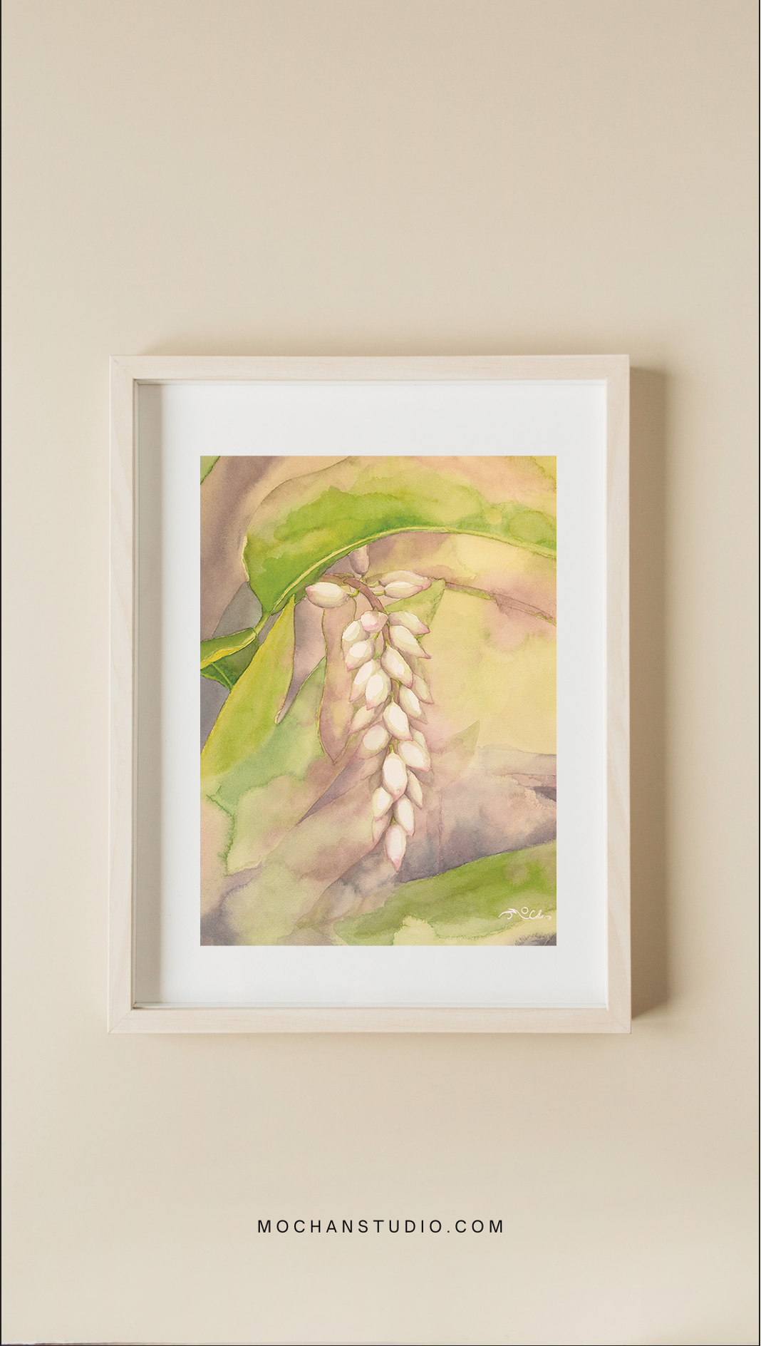 ‘Destiny Flower’ depicts the flower–shell ginger–in its bud state. It is difficult to ignore the sense of inner beauty encapsulated in the pearl-like buds of this flower. A richness much like perfume emanates from the buds, reminding us of our own inner beauty and unique gifts that we are destined to express.